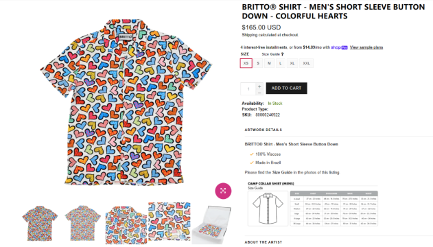 (图片来源:https://www.shopbritto.com/collections/britto%C2%AE-shirts/products/britto%C2%AE-shirt-mens-short-sleeve-button-down-hearts;引用日期2023-6-16)