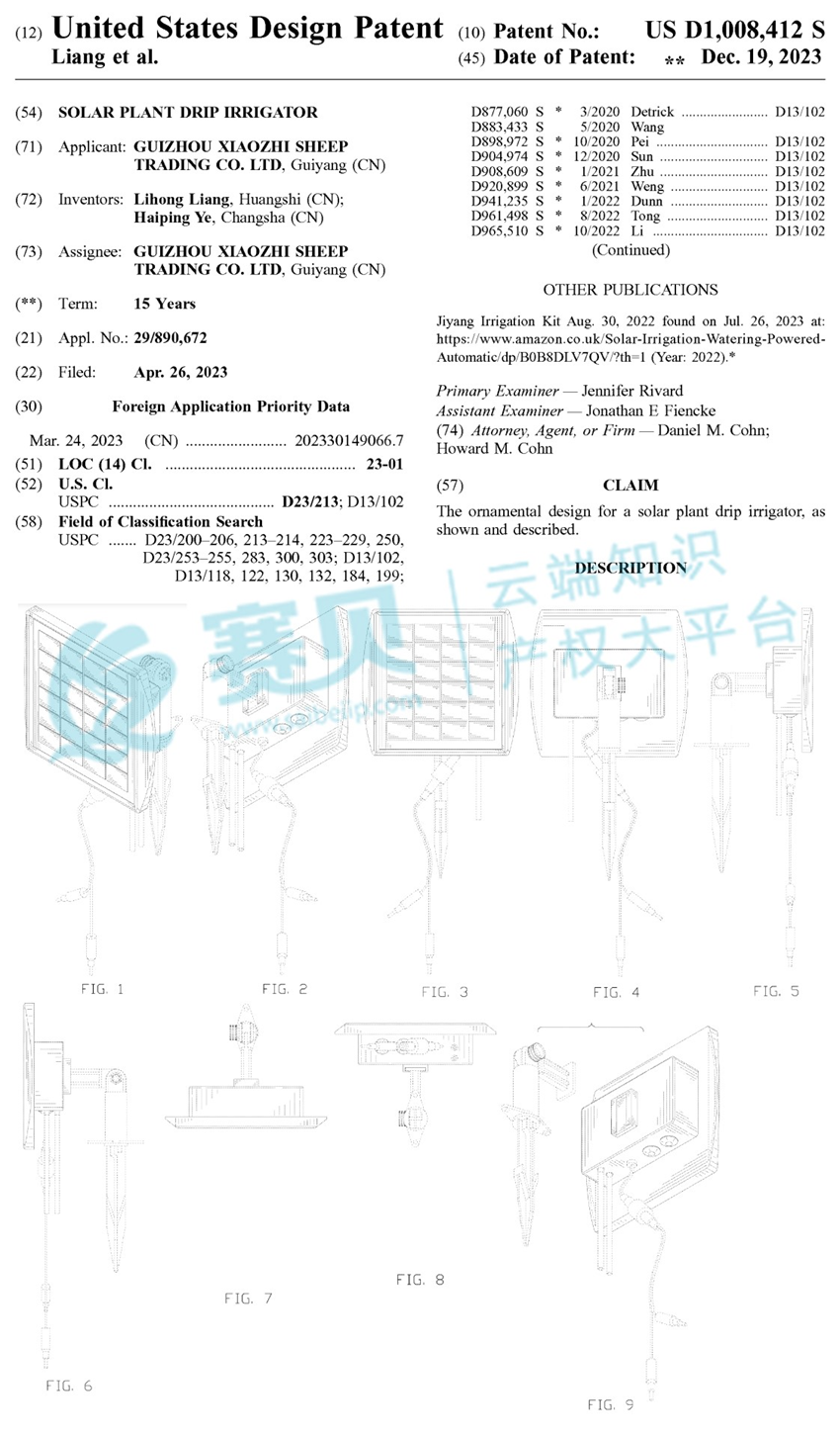 Concord & Sage律所代理太阳能滴管机于2024年6月10日在伊利诺斯州北区发起诉讼案件24-cv-4765,涉及专利侵权,专利号:USD1008412。赛贝建议有销售相关产品的亚马逊卖家朋友尽快下架,以减少损失。