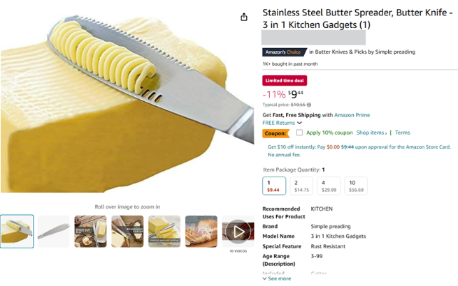 该案还未有重大进展,目前尚未提出TRO(Temporary Restraining Order,临时限制令)动议。Hongying Wang是一位国人卖家,负责Butter Knife黄油刀的销售。这款黄油刀采用最优质的不锈钢制造,持久耐用且高度耐腐蚀。该黄油刀边缘设计为锯齿形,方便切割黄油,而且刀片边缘上的小槽孔还可以将硬黄油卷曲在面包上。使用黄油刀可以有效地控制黄油的用量,同时其宽大的刀刃也方便快速涂抹。