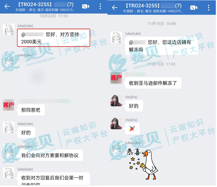 近期,赛贝成功帮助一位已遭缺席判决的亚马逊卖家解冻店铺,使其恢复正常销售。赛贝的美国律师团队在9月27日接到委托后,立即投入工作,经过一个月的努力,最终在10月24日以2000美元的和解金达成TRO和解,目前店铺已经成功解冻并恢复销售。
