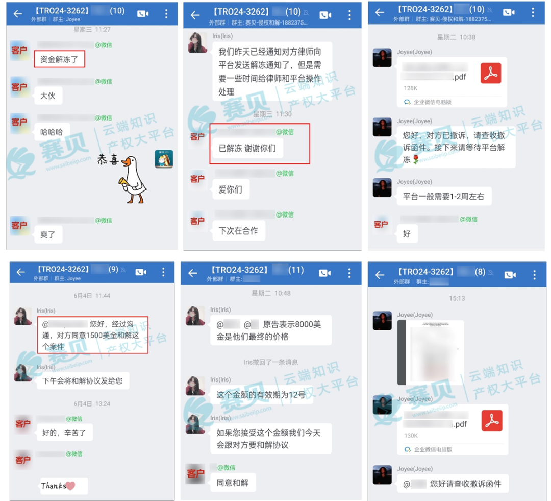 在Minecraft 4月份发起的TRO(临时限制令)诉讼案,赛贝成功协助多位被告卖家以较低的成本达成TRO和解,并解冻了他们的店铺资金。(以下是部分案例截图)