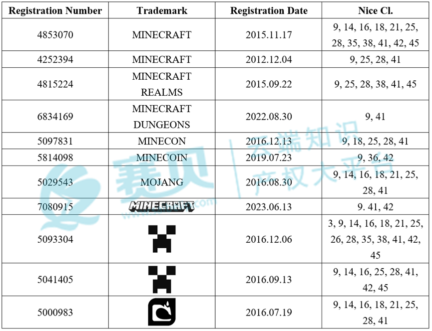 Minecraft《我的世界》在美国拥有多个注册商标,涵盖多个类别。未经授权使用这些商标将可能面临法律诉讼。