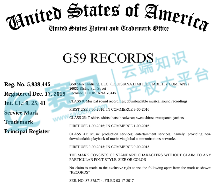 本案涉及的美国注册商标如下,商标注册类别有9(科学仪器)、25(服装鞋帽)和41(教育娱乐),卖家请勿在未经授权的情况下使用这些商标。(图片来源:https://www.g59recordsmerchandise.com/collections/all/products/g59-logo-longsleeve-brown;引用日期2025-1-18)