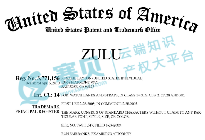 本案涉及的美国注册商标如下,商标注册类别有8(手工器械)、11(灯具空调)和14(珠宝钟表),卖家未经授权请勿使用这些商标。(图片来源:https://www.ebay.ie/itm/ZULU-High-Quality-Heavy-Duty-Nylon-Watch-Strap-Heavy-Duty-NATO-by-ZULUDIVER-/301561984201;引用日期2025-3-2)