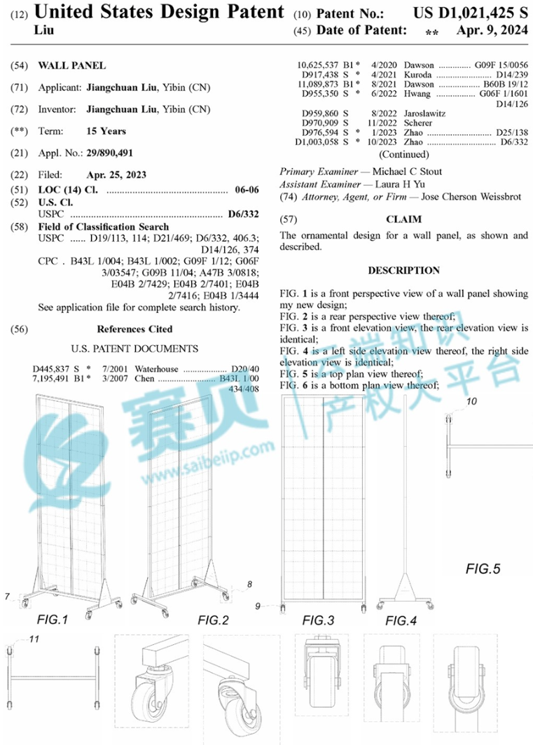 本案涉及一项美国外观设计专利USD1021425S,最早申请日期是2023年4月25日,下证日期是2024年4月9日,在此之后上架的相关外观产品或有侵权风险。