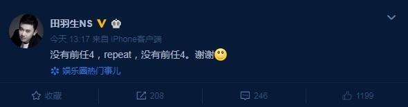 但是很快,《前任》系列导演田羽生微博发文辟谣否认:“没有前任4,repeat,没有前任4。谢谢。”