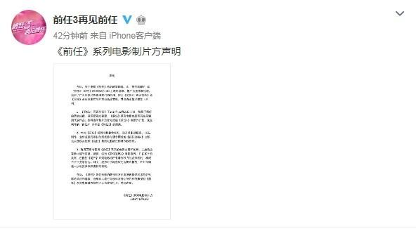 《前任3》官博则给出了一份长声明,表示现在暂无拍摄《前任4》的计划。《前任》官博表示,网传的“前任4”并非是《前任》系列续集,其并未以投资、制作等任何形式参与网传的《前任4》,也未授权其使用《前任》系列电影的著作权,营销号使用《前任》系列的素材为《前任攻略4》做宣传的行为已构成侵权,对此提出警告,并保留进一步追究其法律责任的权利。