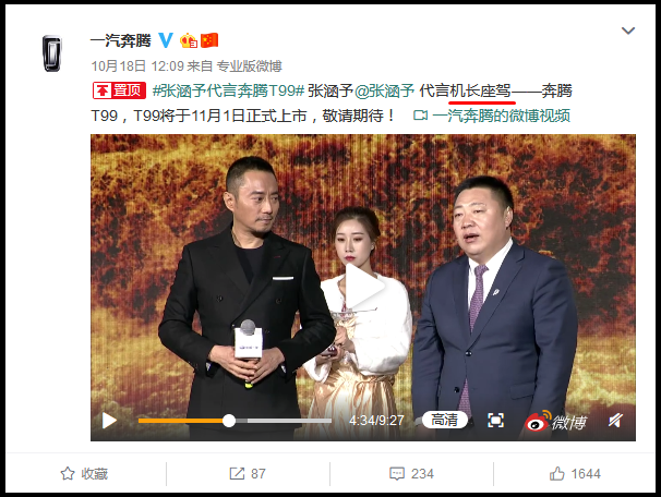 引发双方争议的事件源于10月17日“一汽奔腾品牌之夜”活动,一汽轿车总经理柳长庆在现场宣布《中国机长》主演张涵予为奔腾T99形象代言人。张涵予还将该电影中涉及到的飞机模型,签名后赠与奔腾一方。