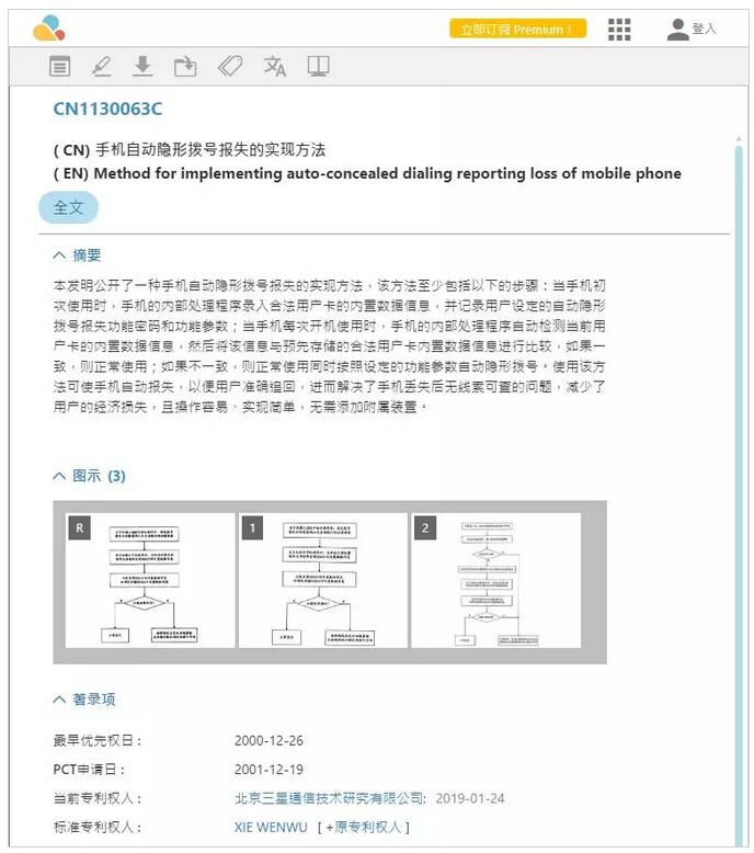 「手机自动隐形拨号报失的实现方法」这份专利让谢文武荣登2002年中央电视台十大专利人物榜单,我们从「当前专利权人」一栏可以看到,目前该专利权属于三星。