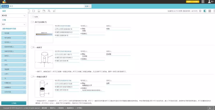 首次使用需要注册并登陆。搜索的时候可以输入想查询的各项外观设计专利信息,如名称、申请号、专利权人等,之后点击「立即获取查询结果」,系统会自动跳转到Patentcould并呈现出查询结果。这里我们以输入杯子为例,来进行检索。