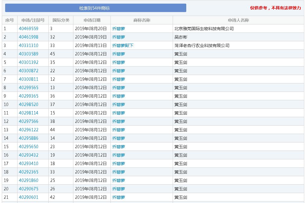 检索“乔碧萝”,可以得到54件商标结果,最早的一件是在2019年7月30日提交的,这正是“乔碧萝殿下”承认直播“露脸事件”并非事故,而是人为策划的时候,也是网友们对这件事议论情绪最高的时候。