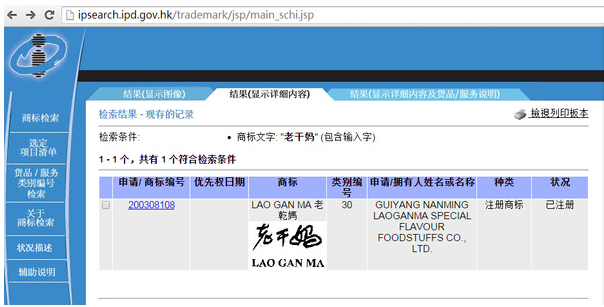 更令人拍手称道的是,“老干妈”不仅注意保护自己在中国的知识产权权益,还早早就走出国门。在查阅了美国专利商标局的商标信息后,发现老干妈早在2001年7月18日就注册了“LAOGANMA”美国商标。