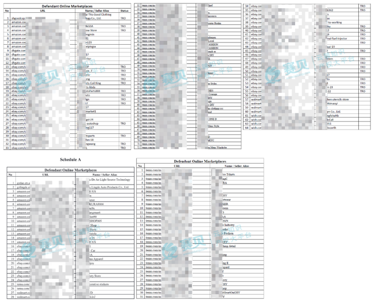 近期,赛贝在自主研发的TRO案件查询系统获悉,由GBC律所代理的GM通用汽车、Volkswagen大众系列、Toyota 丰田、CHRVSLER 克莱斯勒、Daimler 戴姆勒等5大汽车在疯狂发起TRO维权,据赛贝不完全统计,截至目前,合计有338家,亚马逊、Temu、敦煌网(dhgate)、ebay、沃尔玛(walmart)、全球速卖通(wish)等平台的店铺被起诉!