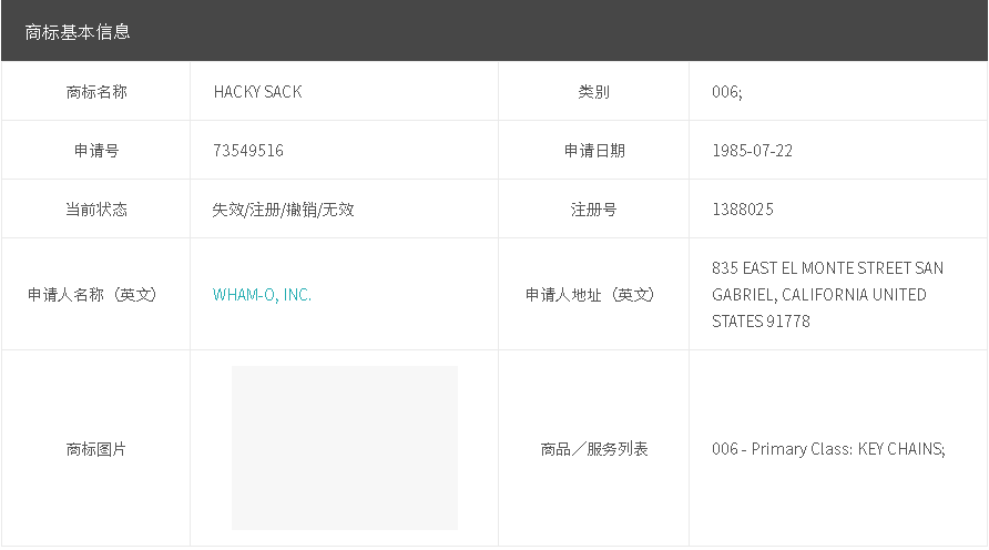 可能很多卖家朋友都没听过这个品牌,通过赛贝知识产权平台商标查询发现,HACKY SACK早在1985年7月22日就被WHAM-O 公司申请商标注册,注册公告日期为1986年4月1日,注册在025(服装鞋帽)、028(玩具健身)、041(教育娱乐)三个大类。