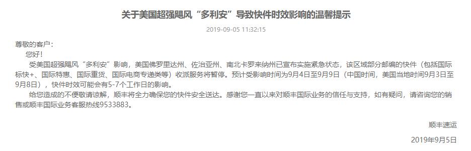 今日,顺丰速运也发布美国超强飓风“多利安”导致快件时效影响的通知,通知显示,受美国超强飓风“多利安”影响,美国佛罗里达州、佐治亚州、南北卡罗来纳州已宣布实施紧急状态,该区域部分邮编的快件(包括国际标快+、国际特惠、国际重货、国际电商专递类等)收派服务将暂停。预计受影响时间为9月4日至9月9日(中国时间,美国当地时间9月3日至9月8日),快件时效可能会有5-7个工作日的影响。
