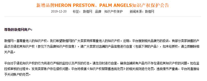 近日敦煌网也发布了HERON PRESTON、PALM ANGELS品牌知识产权保护公告,要求卖家对店铺的产品信息进行自查(包括下架的产品),如未经授权,立即删除相关产品。