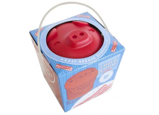 这款猪油罐造型比较可爱,是一款厨房用品。使用者煎完培根或者其他肉类,可以将多余的油倒入罐中,上层的滤网可以将油渣过滤出来,底下盛滤过的油,冷却以后就会变成猪油,方便之后使用。