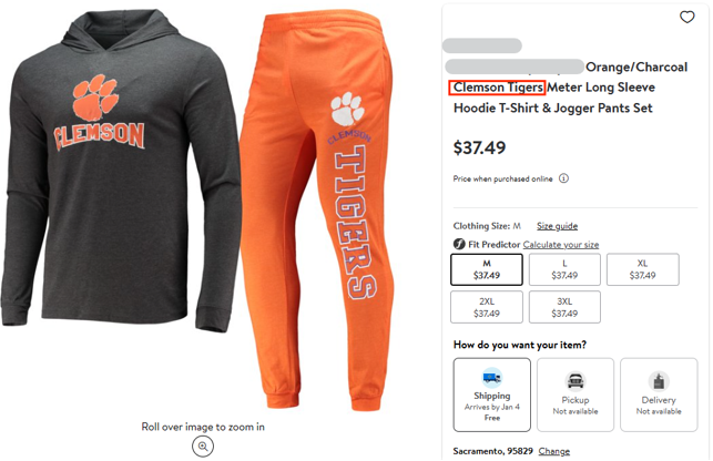 原告注册了非常多商标,比如CLEMSON TIGERS、KU、UCLA、MICHIGAN等,文字图形商标则要注意不要出现在产品的标题以及描述里,图形商标需要注意产品的外观以及包装上是否有侵权嫌疑。