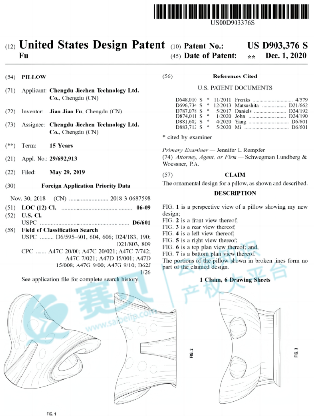 涉事案件的产品是按摩枕,专利号为D903376, 最早申请日期是2019年5月29日,下证日期是2020年12月1日。这是继上一次国人颈肩按摩枕的第二个按摩枕产品,可见该类产品的种类多且容易踩雷,所以卖家朋友们选品时请注意避开可能侵权的产品。