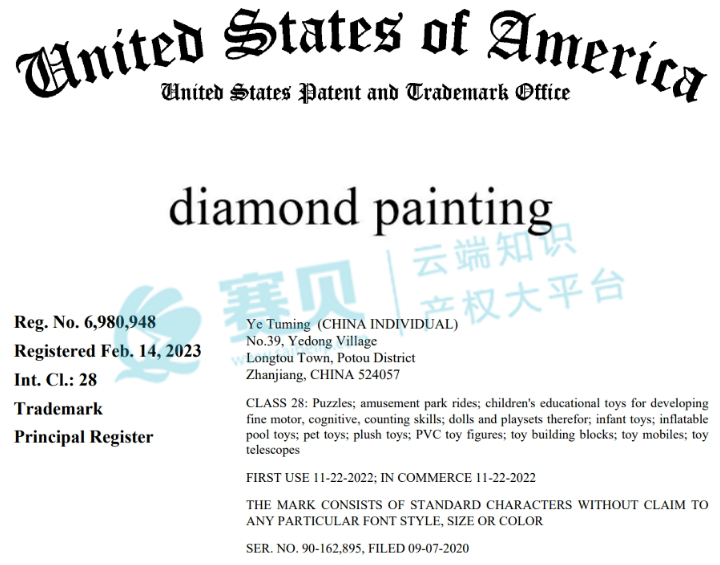 注册商标 本案涉及的美国注册商标为文字商标diamond painting,商标注册类别为第28大类健身器材,产品类型为玩具,卖家请勿在未经授权的情况下使用该商标。