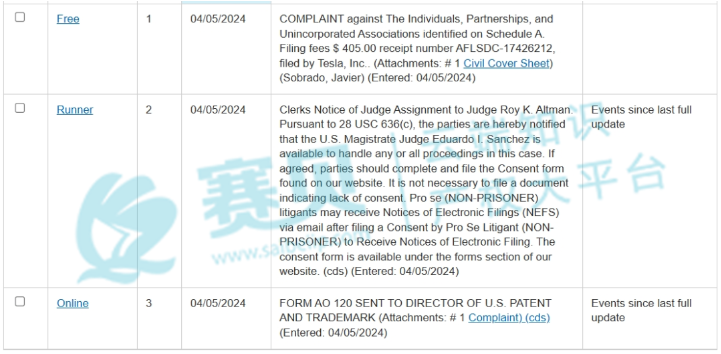 Tesla, Inc.于2024年4月4日和5日在佛罗里达南区连发四案,目前案件24-cv-21263、24-cv-21265、24-cv-60530和24-cv-21278都未有重大进展。有销售相关产品的卖家朋友需要尽快下架产品,以减少损失。