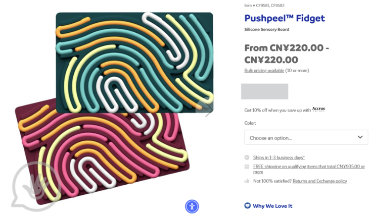该案还未有重大进展,目前尚未提出TRO(Temporary Restraining Order,临时限制令)动议。Pushpeel LLC由Aviva Weiss创立,主要销售儿童感官玩具。Pushpeel感官活动板是该公司旗下的产品,采用CPC认证的优质无毒硅胶制成,配置有11根色彩鲜艳的绳子,将这些硅胶绳推入凹槽板中,以帮助儿童提高双侧协调性、视觉运动技能和手指灵活性,对患有自闭症、多动症、注意力缺陷多动症和强迫症的人有益。官网:https://funandfunction.com/
