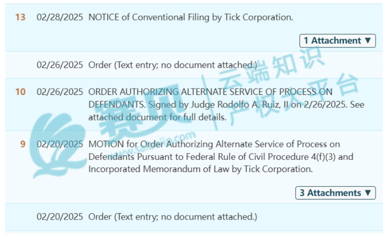 Sriplaw, P.A.律所代理ZULU/MARATAC表带于2025年2月11日在佛罗里达南区发起诉讼案件25-cv-20633,涉商标及侵权。赛贝建议亚马逊、沃尔玛、阿里国际、eBay、Temu等平台的卖家朋友速速自查店铺链接,及时下架,以减少损失。