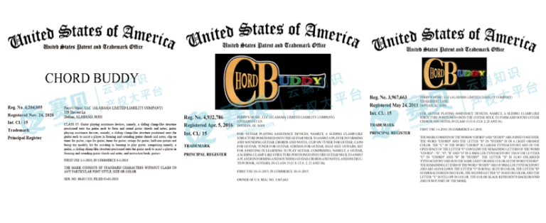 本案涉及 “CHORD BUDDY” 系列商标,如注册号为 3967663、4932786、6204055的商标,这些商标用于吉他辅助设备等产品,不可以轻易使用在产品的标题、包装上,否则会有侵权风险。