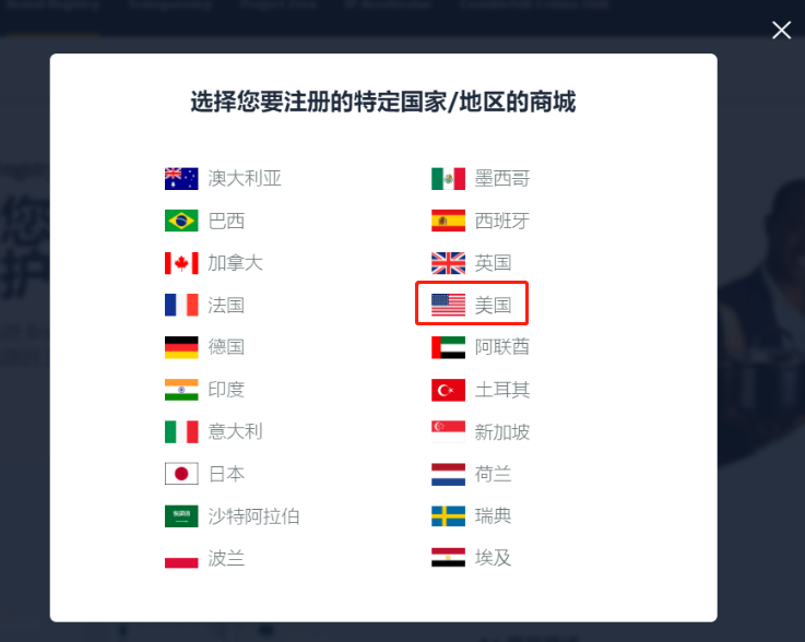 ① 点击链接 https://brandservices.amazon.com/?lang=zh-CN 前往亚马逊品牌注册官网并登录,点击右上角“登录”,选择您要注册的国家/地区的对应站点。比如,你想做美国站品牌备案,此处选择“美国”。