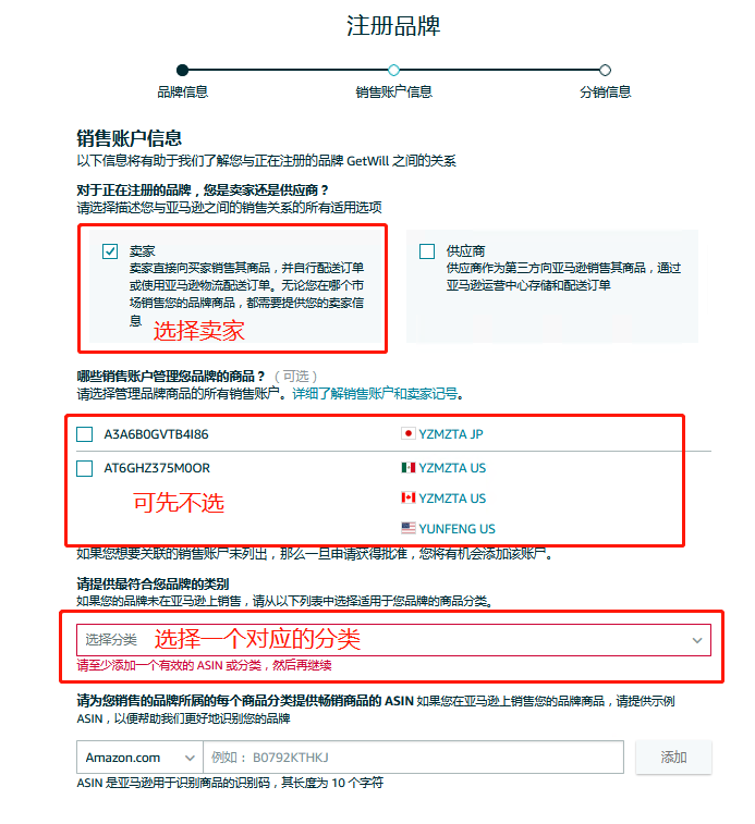 ⑤ 填写账户信息,一般情况下选择 “ 卖家 ”,ASIN 可以选填(但如果在售产品是这个品牌,可以填写该产品的 ASIN,然后选择品牌对应分类);