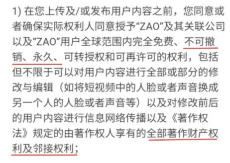 上面截图部分是ZAO 的用户协议中争议最大的地方,用户使用 ZAO 需要上传自己的肖像,上传之后ZAO 可以免费使用并修改用户的肖像,还可以凭其意愿将用户肖像授权给第三方。