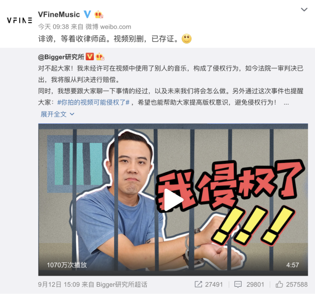 原来,在歌曲侵权事件结束后,Bigger研究所发了一个科普视频,在视频中表述了他和VFine打官司的的经过,并创建话题#你拍的视频可能侵权了# ,和网友一起提高版权意识。
