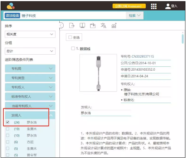 赛贝小编用专利检索网Patentcloud 输入锤子科技,发现锤子科技已经申请80多篇专利。
