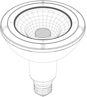 这是一盏LED灯的外观设计,与上面手推车的例子明显不同的是,灯的下半部分全部是虚线,只有上半部分为实线,这就表明专利要保护的是灯的开口部分及周边部位的设计,而说明书也明确阐述了,虚线部分仅用于描述与设计相关的应用环境,不构成权利要求的保护范围。