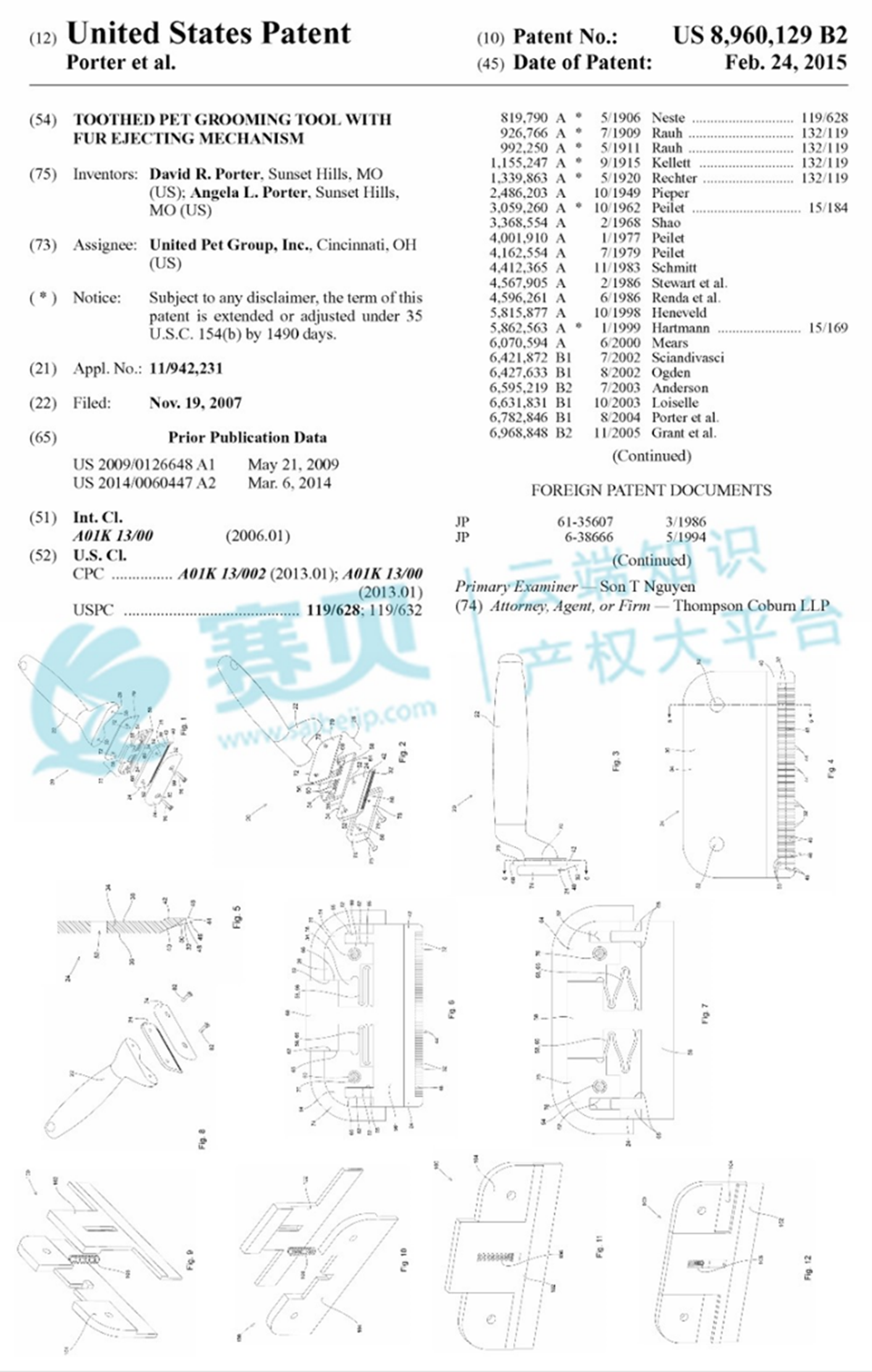 本案涉及美国发明专利US8960129B2,该专利主要保护一种宠物毛发梳理工具,具有自清洁功能。其设计包括一个刷头和一个处理器,刷头上设置有刷片,当使用完毕后,可以通过处理器将刷片清洁干净,方便下次使用。这项专利的创新之处在于引入了自清洁功能,解决了传统宠物梳理工具难以清理的问题,使得宠物主人可以更方便地使用掉毛刷进行宠物美容护理。