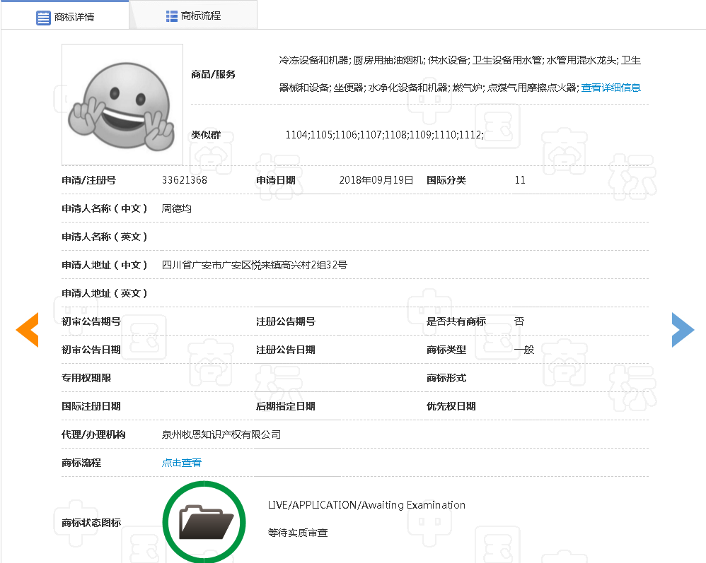 经商标查询发现,这枚“耶”商标被注册在第11类,商品服务是供水设备、卫生设备用水管、水管用混水龙头、坐便器等等。