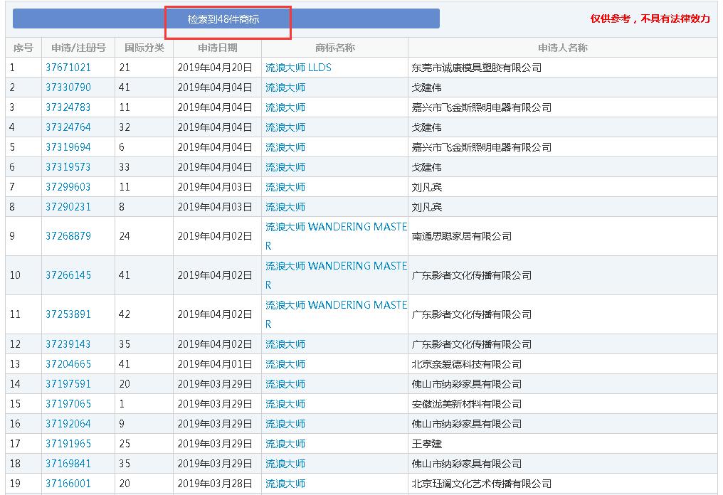 通过商标查询可发现,从2019年3月21日起,截至目前,已经有48件“流浪大师”相关的商标注册申请,商标注册类别涵盖第21类、第41类、第11类、第35类、第25类等多类别,国民抓热点的速度还是相关快的。