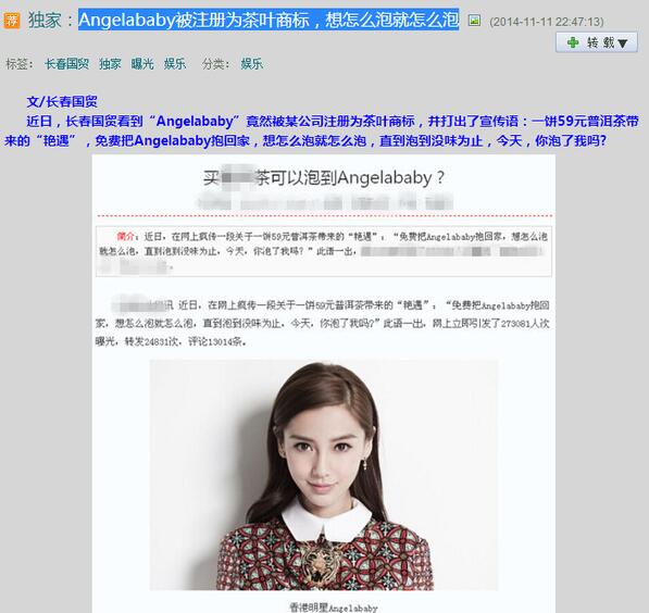 2014年11月11日,也就是光棍节的晚上,知名博客“长春国贸”披露:近日,长春国贸看到“Angelababy”竟然被某公司注册为茶叶商标,并打出了宣传语:一饼59元普洱茶带来的“艳遇”,免费把Angelababy抱回家,想怎么泡就怎么泡,直到泡到没味为止,今天,你泡了我吗?