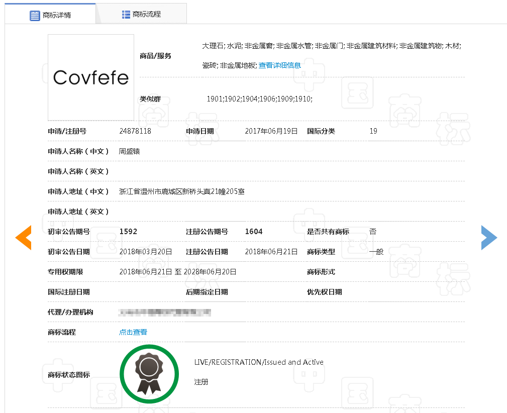 这枚注册号为24878118的COVFEFE商标(下称争议商标)是自然人周盛辕在2017年6月19日申请注册的,并于2018年6月21日注册成功,商标注册类别为第19类。