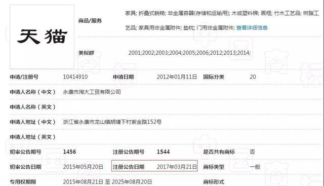 2012年1月11日,也就是淘宝商城宣布更名的同一天,浙江永康市淘大工贸有限公司(下称淘大公司)在分别在第11类照明器械、第20家具第21烹饪锅、厨房用具等商品上申请注册“天猫”商标。目前,这3件商标均已经是核准注册商标。