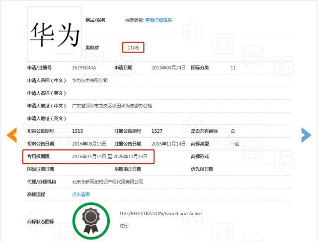最终,华为公司还是成功注册了第16795044号“华为”商标,不过小项有所变化。
