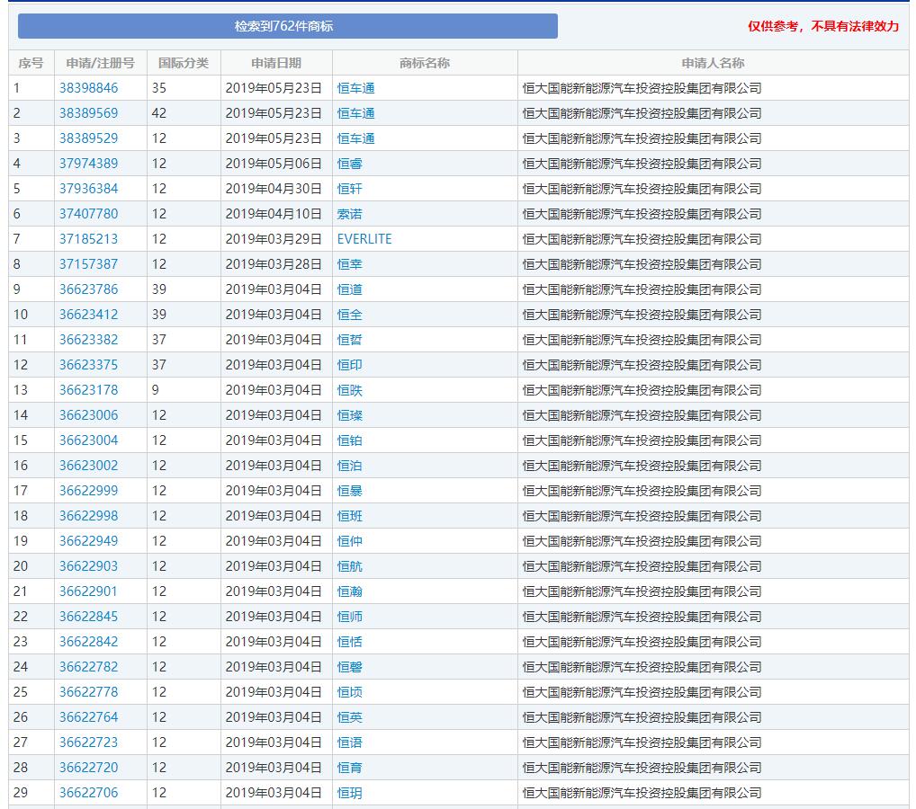 此外,通过商标查询还可发现,恒大国能新能源汽车投资控股集团有限公司在今年3月-5月之间,一共提交了761件“恒X”商标注册申请,大部分都是在2019年3月4日当天提交的,商标名称包括“恒车通”“恒轩”“恒睿”“恒瀚”“恒磬”“恒制”“恒容”“恒瑜”“恒致”“恒顷”......只要你能想到的,恒大全都申请注册了,而且商标注册类别基本都是第12类运输工具。