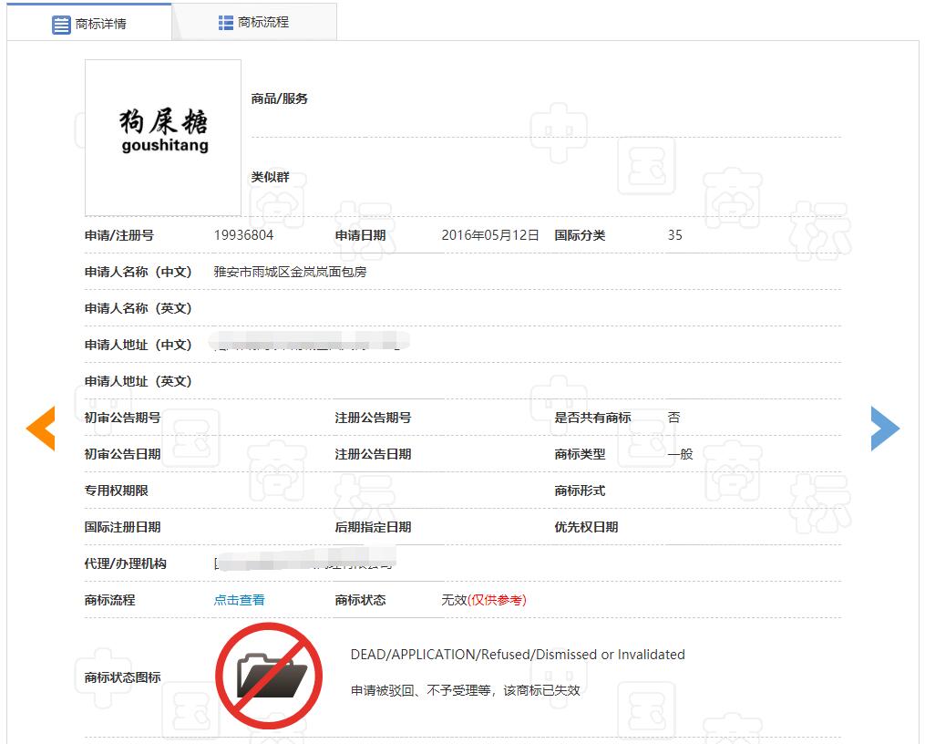 此外,雅安市雨城区金岚岚面包房还在2016年5月12日提交了第35类“狗屎糖”商标注册申请,这件商标目前也被驳回了。