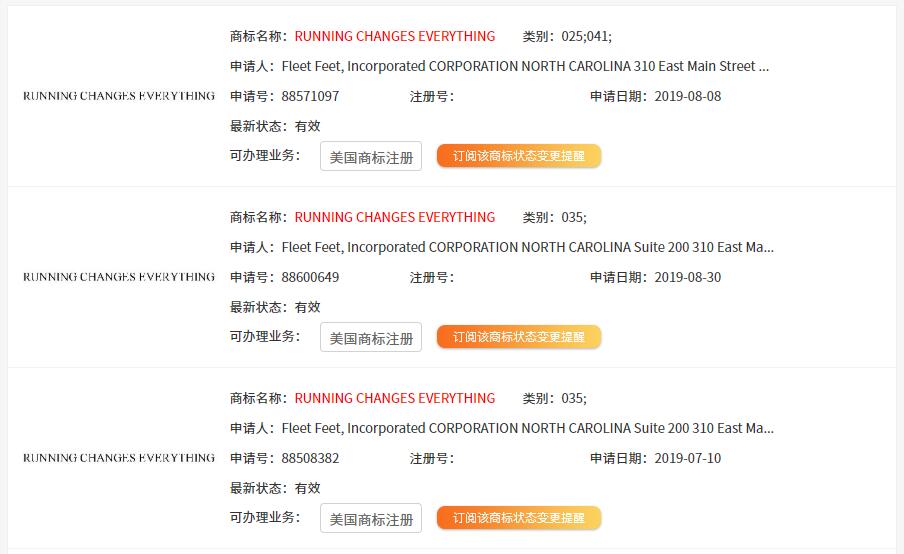 此外,Fleet Feet还在今年7月和8月分别提交了三件“Running Changes Everything”商标注册申请,商标类别同样也是第35类、第41类以及第25类。