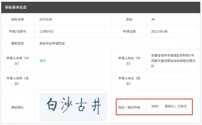 古井贡酒对「白沙古井」商标提出的无效宣告请求,想要搞掉这枚2012年6月8日申请的商标。但是正如上图所示,「白沙古井」注册的商品类别是巧克力,这和卖酒的有啥关系?