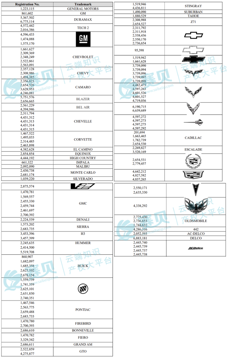 通用汽车旗下汇聚了众多享誉世界的汽车品牌,如雪佛兰(Chevrolet)、别克(Buick)、凯迪拉克(Cadillac)、GMC、五菱、宝骏、霍顿、吉优等,这些品牌各具特色,共同构筑了通用汽车强大的品牌阵容。值得注意的是,雪佛兰(Chevrolet)、别克(Buick)、凯迪拉克(Cadillac)等品牌已积极采取法律行动,发起TRO商标维权。以下是正在维权的商标,赛贝提醒跨境卖家请注意排查,避免侵权。