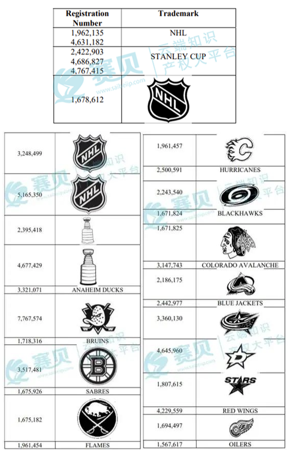 品牌简介:NHL于1917年正式成立,是由北美地区的冰球队伍共同组建的职业运动联盟,是全球顶级水准的职业冰球联赛。案件涉及涵盖多个冰球俱乐部和相关组织的商标,涵盖多个类别,包括服装、玩具和体育用品等,未经授权不得擅自使用。